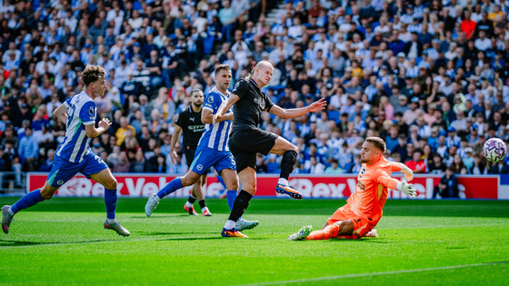 The City striker was the biggest goal threat in the opening exchanges, dragging a shot wide and having a farpost header scrambled off the line by Brighton keeper Bart Verbruggen before he finally found the breakthrough.