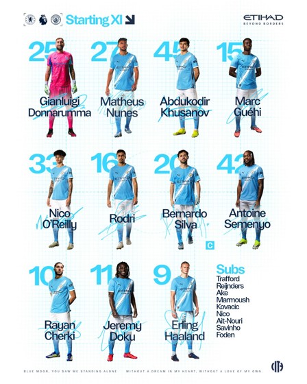 City XI: Donnarumma, Nunes, Khusanov, Guéhi, O’Reilly, Rodri, Bernardo (C), Semenyo, Cherki, Doku, Haaland.