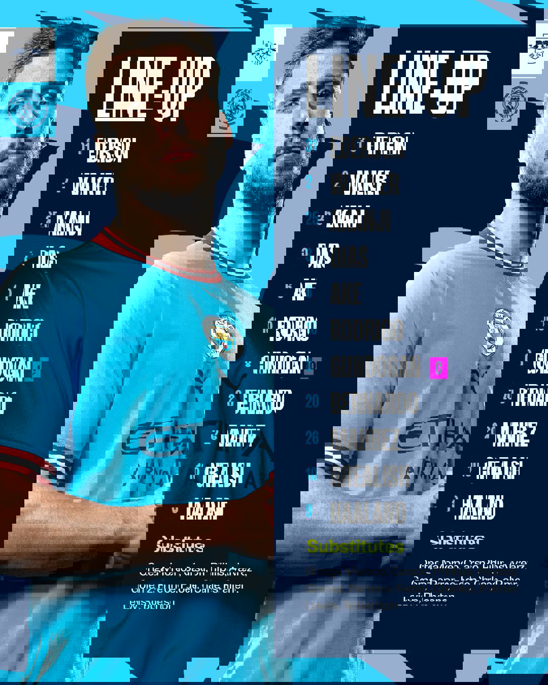 CITY XI: Ederson, Walker, Akanji, Dias, Ake, Rodrigo, Gundogan, Bernardo, Mahrez, Grealish, Haaland