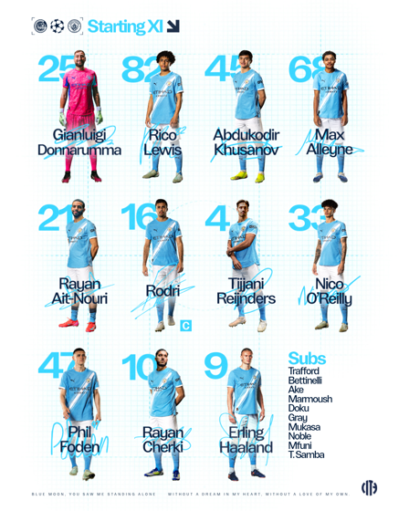 CITY XI: Donnarumma, Lewis, Khusanov, Alleyne, Ait-Nouri, Rodri (C), Reijnders, O’Reilly, Foden, Cherki, Haaland.
