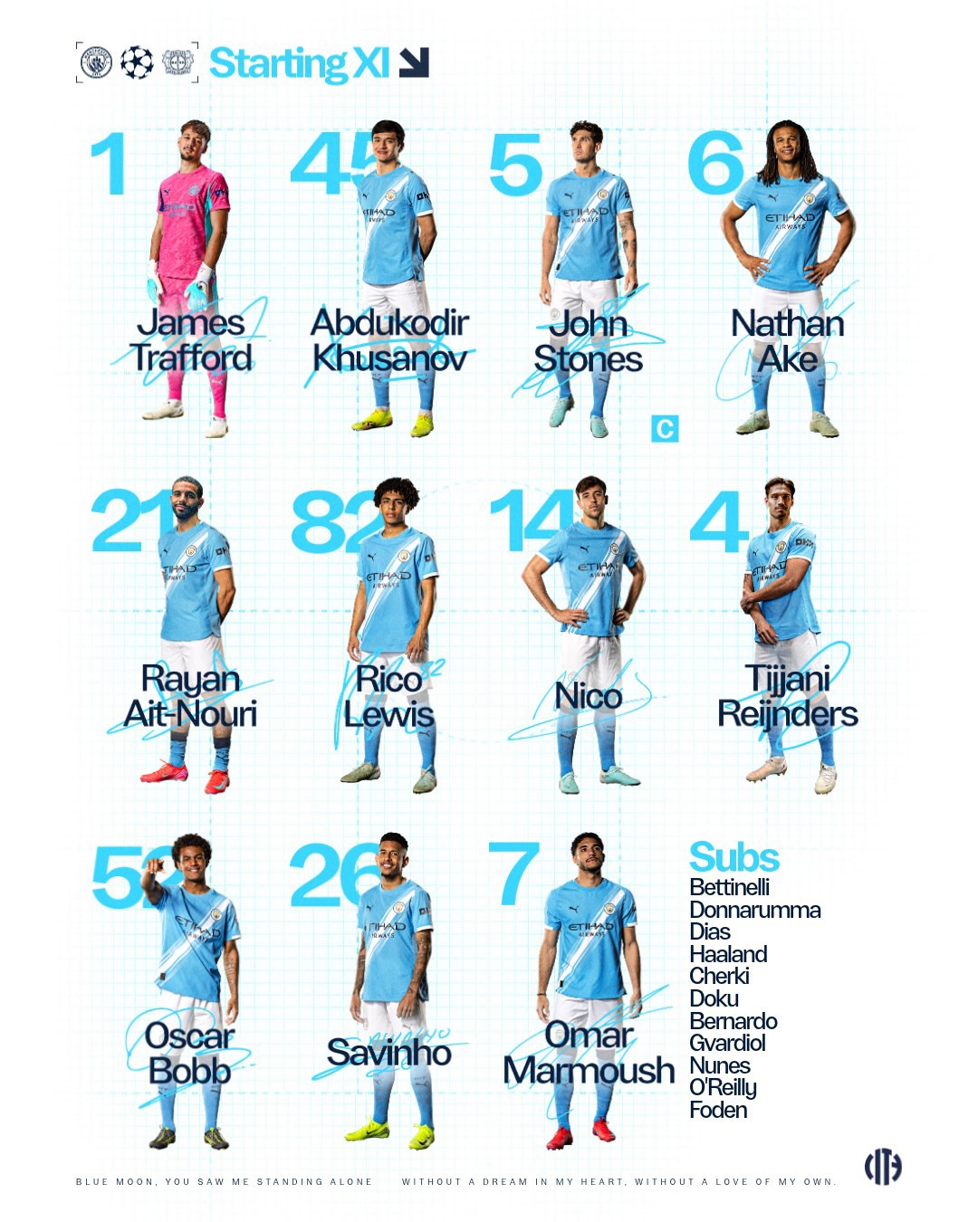 CITY XI: Trafford, Khusanov, Stones (C), Ake, Ait-Nouri, Lewis, Nico, Reijnders, Bobb, Savinho, Marmoush