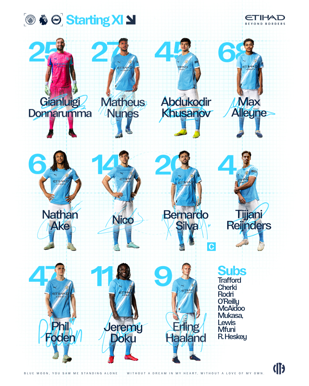 CITY XI: Donnarumma, Nunes, Khusanov, Alleyne, Ake, Nico, Bernardo (C), Reijnders, Foden, Doku, Haaland