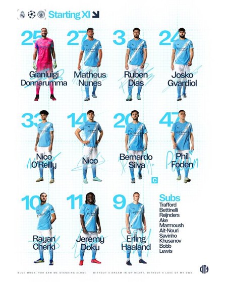 CITY XI: Donnarumma, Nunes, Dias, Gvardiol, O’Reilly, Nico, Bernardo (C), Foden, Cherki, Doku, Haaland