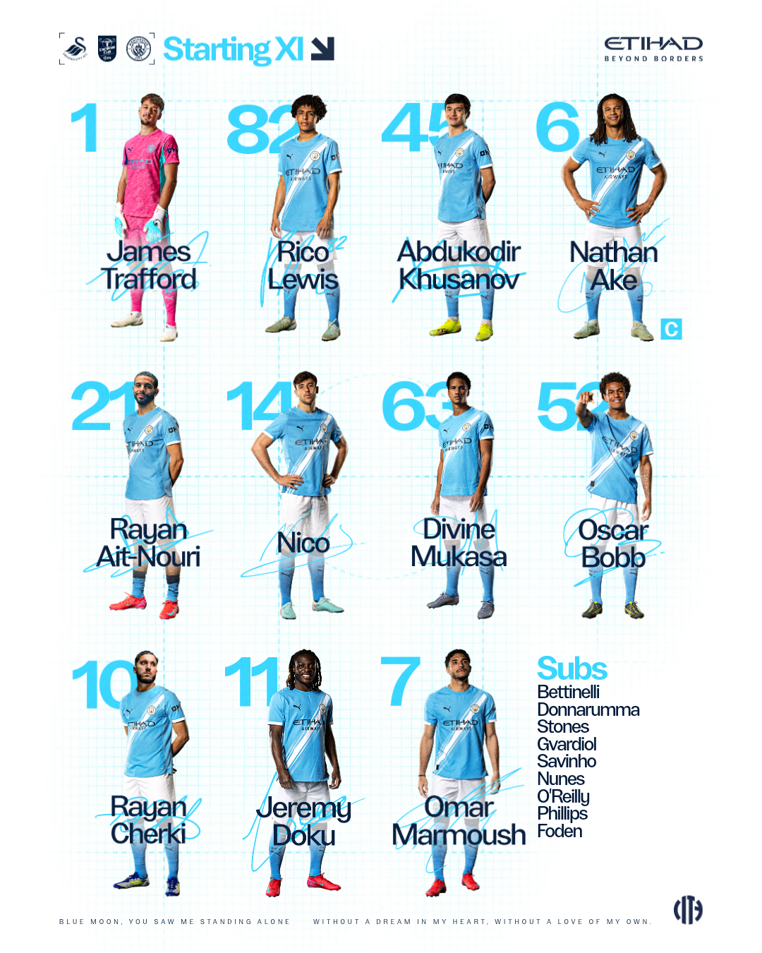 City XI: Trafford, Lewis, Khusanov, Ake (C), Ait-Nouri, Nico, Mukasa, Bobb, Cherki, Doku, Marmoush